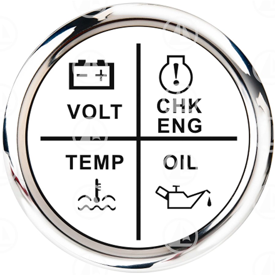 Strumento indicatore analogico multifuzione. Consente di controllare simultaneamente nello stesso strumento i seguenti valori - VOLT - CHECK ENGINE - TEMPERATURA ACQUA - ALLARME PRESSIONE OLIO - Illuminazione led Rosso - Colore Bianco - Cornice Cromata - 52 mm VOLT/CHECK ENGINE/WATER TEMP/OIL PRESSURE ALARM GAUGE(WHITE FACE/CHROME RIM)(RED LED BACKLIGHT)
