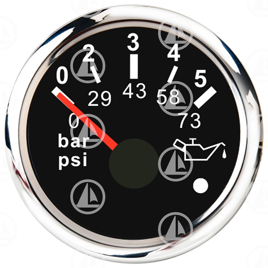 Strumento indicatore analogico pressione olio - Illuminazione led Bianco - Colore Nero - Cornice Cromata - Diametro 52 mm - 10 - 184 OHM - RANGE 0-5 bar -0 -73 psi - 52MM ELECTRICAL OIL PRESSURE GAUGE WITH WARNING LIGHT (BLACK FACE/ CHROME RIM) SUPER WHITE LED DISPLAY 0?5BAR