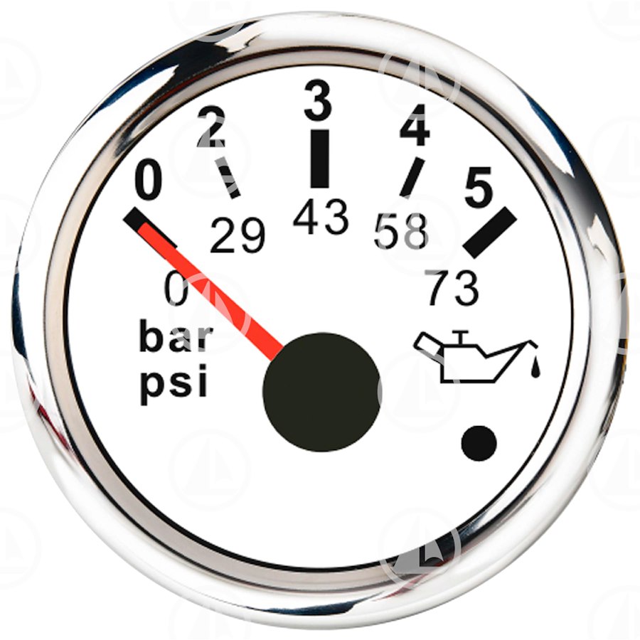 Strumento indicatore analogico pressione olio - Illuminazione led Rosso - Colore Bianco - Cornice Cromata - Diametro 52 mm - 10 - 184 OHM - RANGE 0-5 bar -0 -73 psi 52MM ELECTRICAL OIL PRESSURE GAUGE WITH WARNING FUNCTION (WHITE FACE/ CHROME RIM) RED LED DISPLAY 0?5BAR